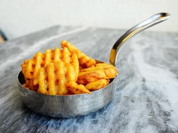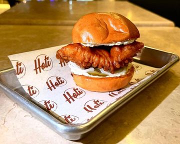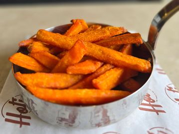 Crispy Fried Cluckers, French Fries, Toasted Sweet Potato Bun, Honey Mustard Sauce & Pickles.